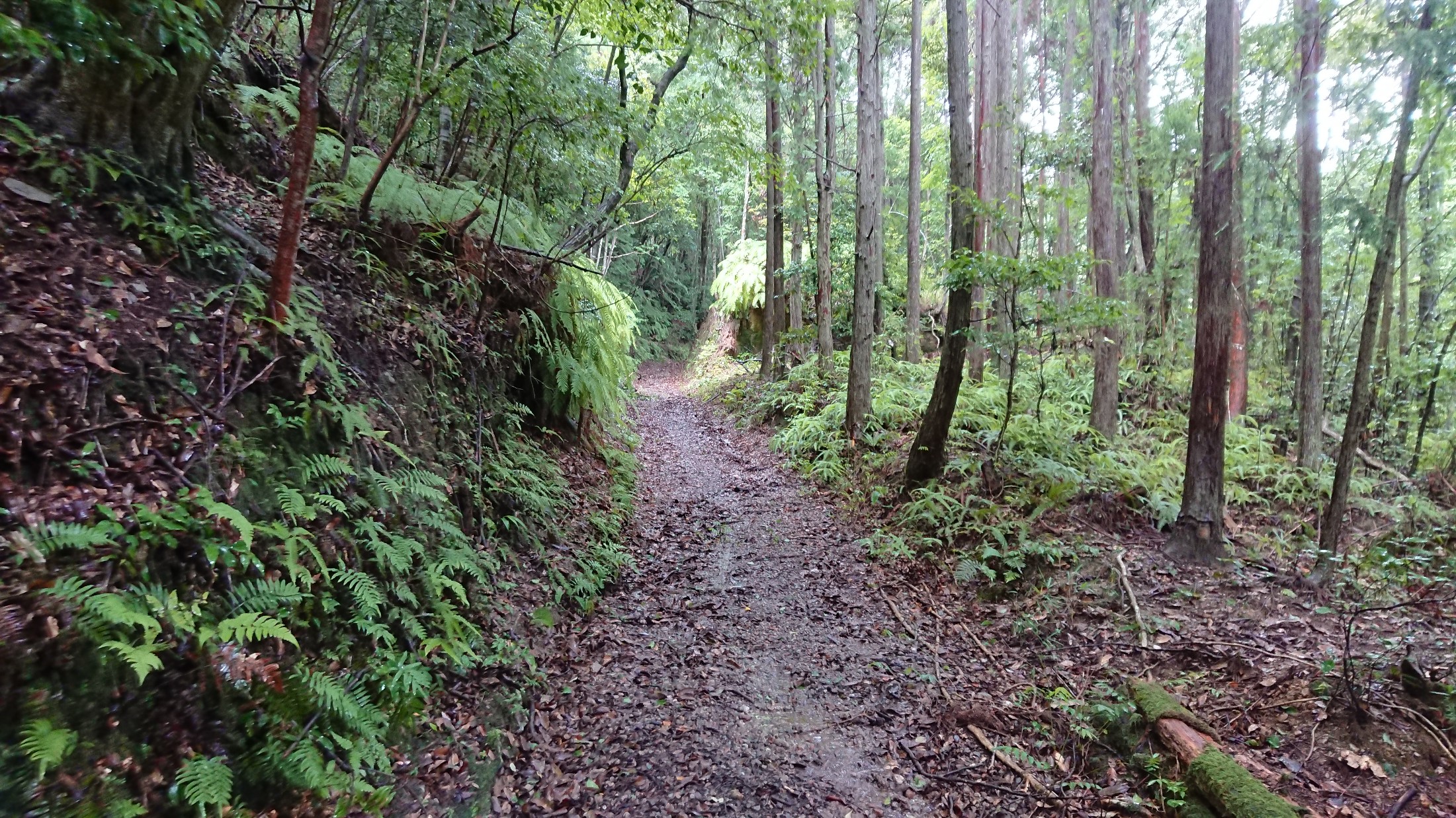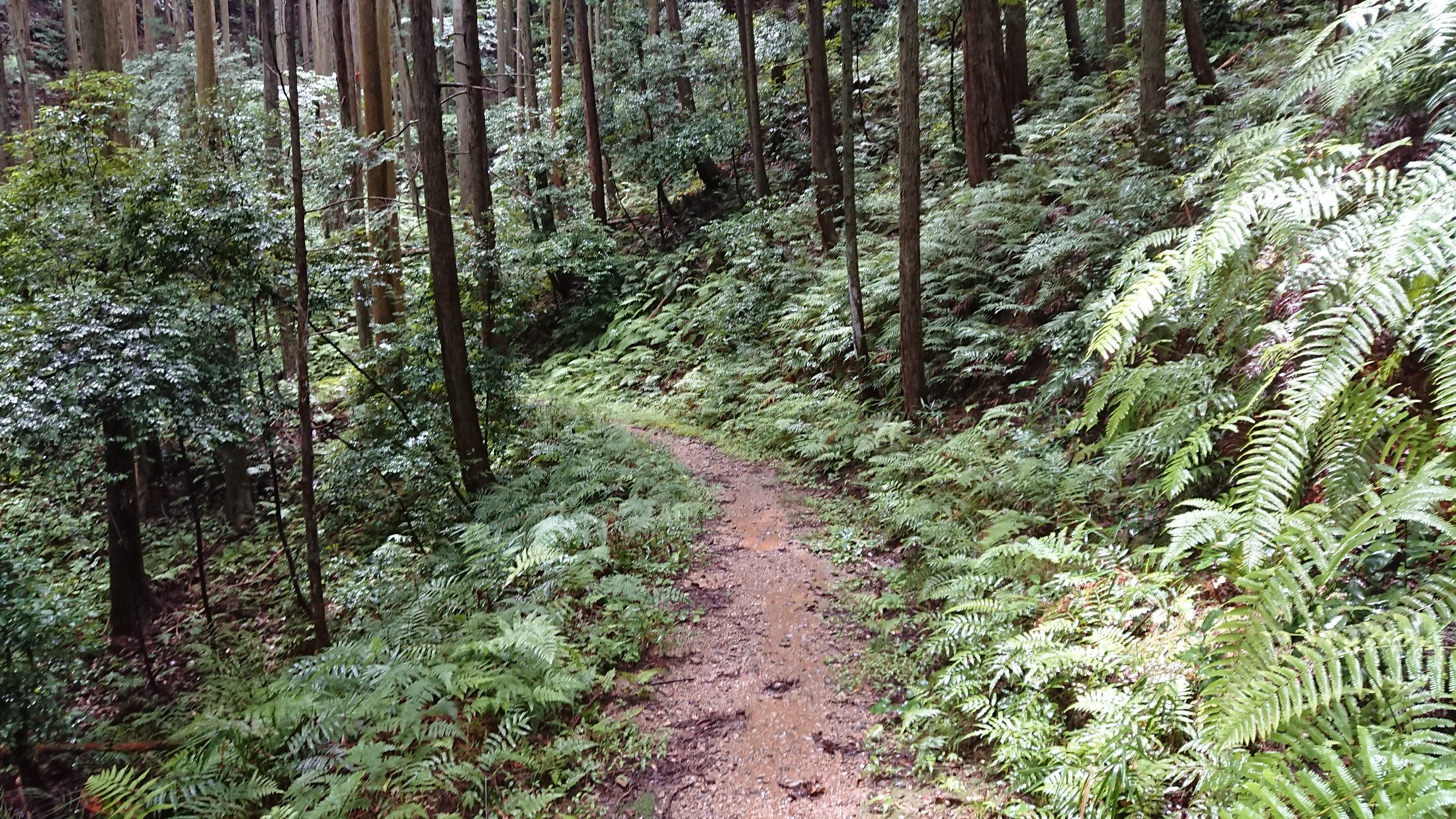 このあたりから少し雨が降ってきたので、雨宿りしながらお昼にし、小降りになってから出発しました。 しかし、出発後まもなく雨が激しくなってきました。 女鬼峠の入り口付近の小屋を勝手にお借りしてカッパを着ました。