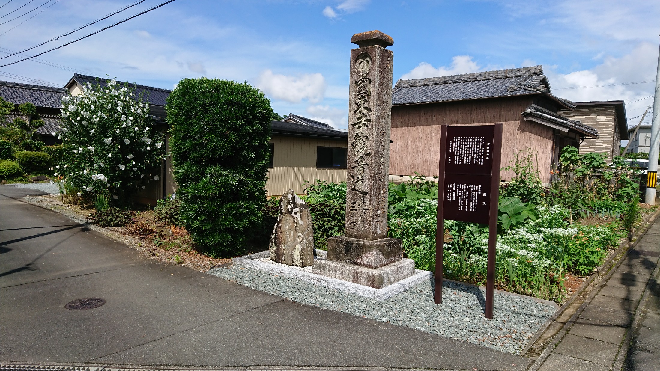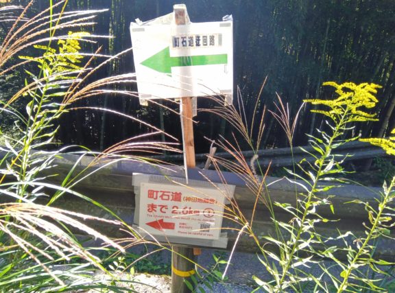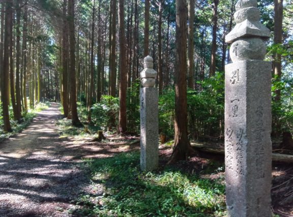 立派な道標が現れますので、ここを左。 道標には「左 さんぐうみち」「右 くまのみち」と刻まれています。 これらの道標は江戸時代に建てられたもので、道路改良により分散されていましたが、世界遺産登録15周年を記念して元の位置に戻されたそうです。 当時は熊野道、参宮道、国束参道の分岐で交通の要衝であり、ここには人力車の詰所や旅籠があったそうです。 ちなみに、この道標は田辺市熊野ツーリズムビューローさんの地図にはこの道標は載っていません。 おそらく、世界遺産登録15周年(2019年)、つまり最近ここに移された(戻された)からでしょう。 なので、地図を見ながら「左にしか曲がれないところを左」などと、地図とにらめっこしながら歩きました。