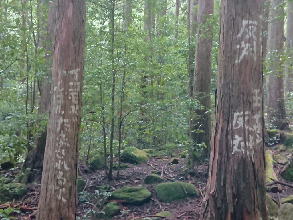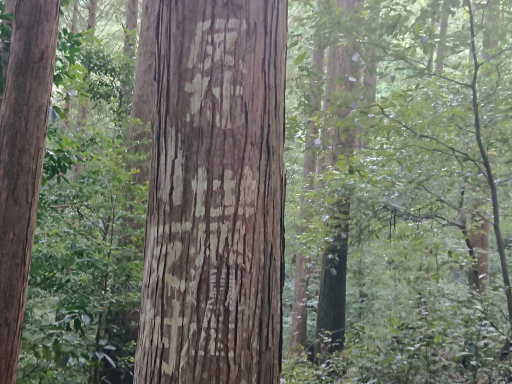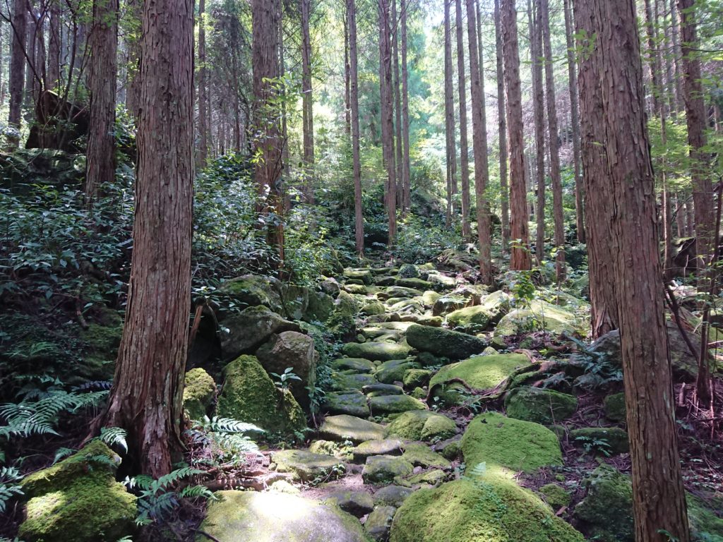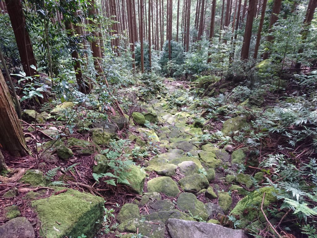 古道沿いに生えている杉の枝が台風などで少なくなり太陽光が射すようになったことも原因だと聞きましたが、登録後に増えた参詣者が歩いて削ってしまったことも原因だということも聞きました。